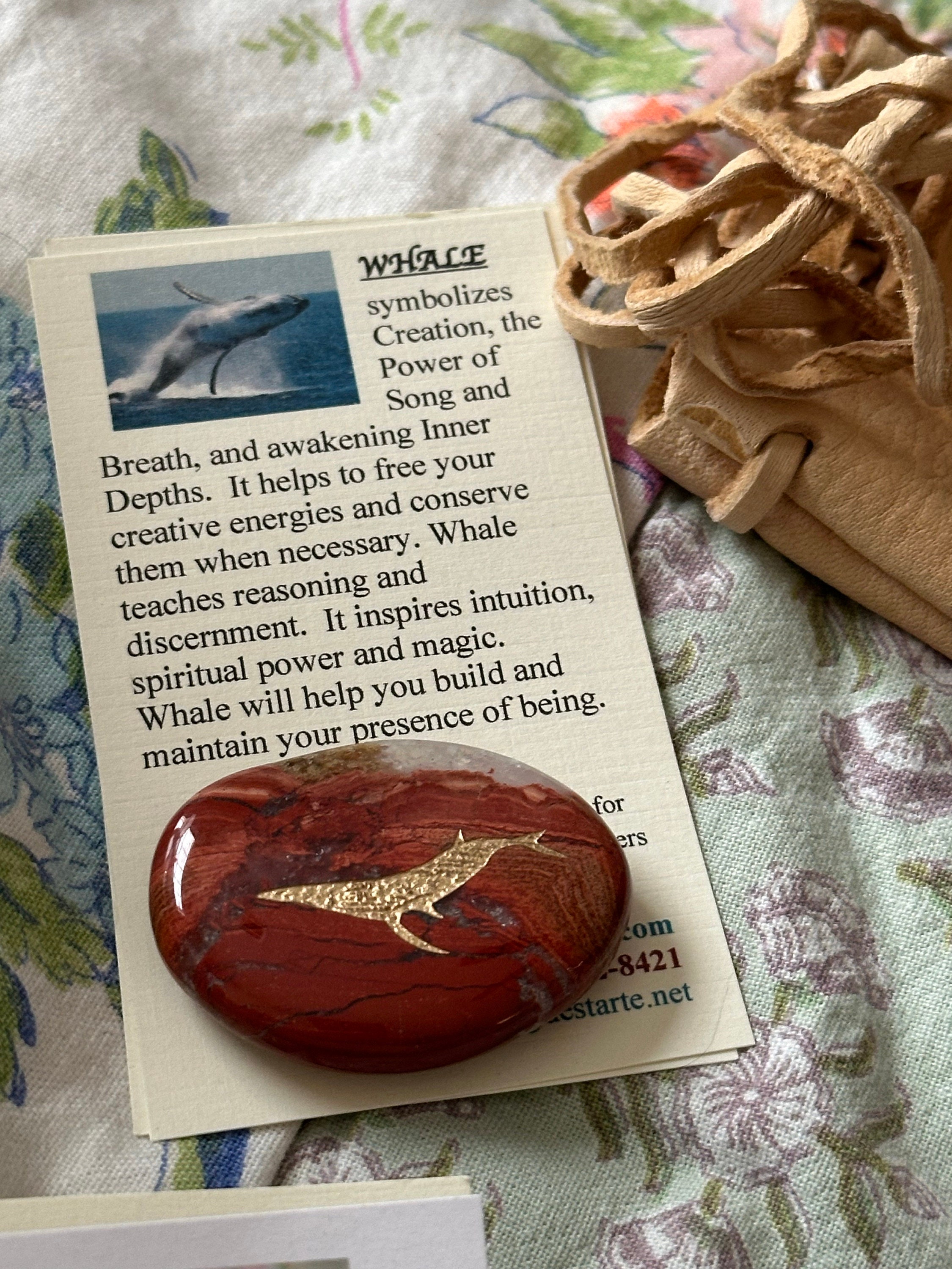 10 Premium Whale Totem Stones in 2 Aventurine, 1 Black Onyx, 4 Howlite, 2 Tiger Iron Jasper and 1 White Lace Red Jasper engraved and embossed in gold. These are exceptionally smooth and larger, thicker stones. The size is approximately 1 1/2 - 2 inches. Stone will be chosen at random from your color choice. Known as worry stones, comfort stones, fidget stones, palm stones, or thumb stones. They are smooth, polished gemstones in the shape of an oval or rounded rectangle used for relaxation or anxiety relief. They are used by holding the stone between the index finger and thumb and gently moving one’s thumb back and forth across the stone. This action of moving one’s thumb back and forth across the stone can reduce stress. Can be carried in a pocket, purse, or pouch around the neck. Comes with power animal and stone properties cards.